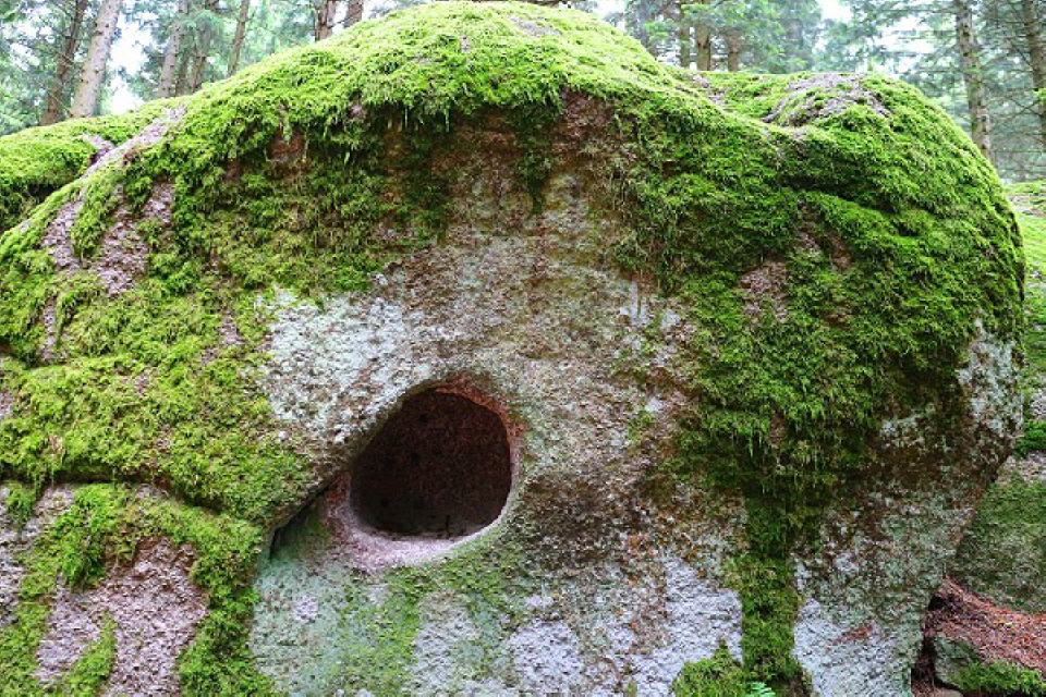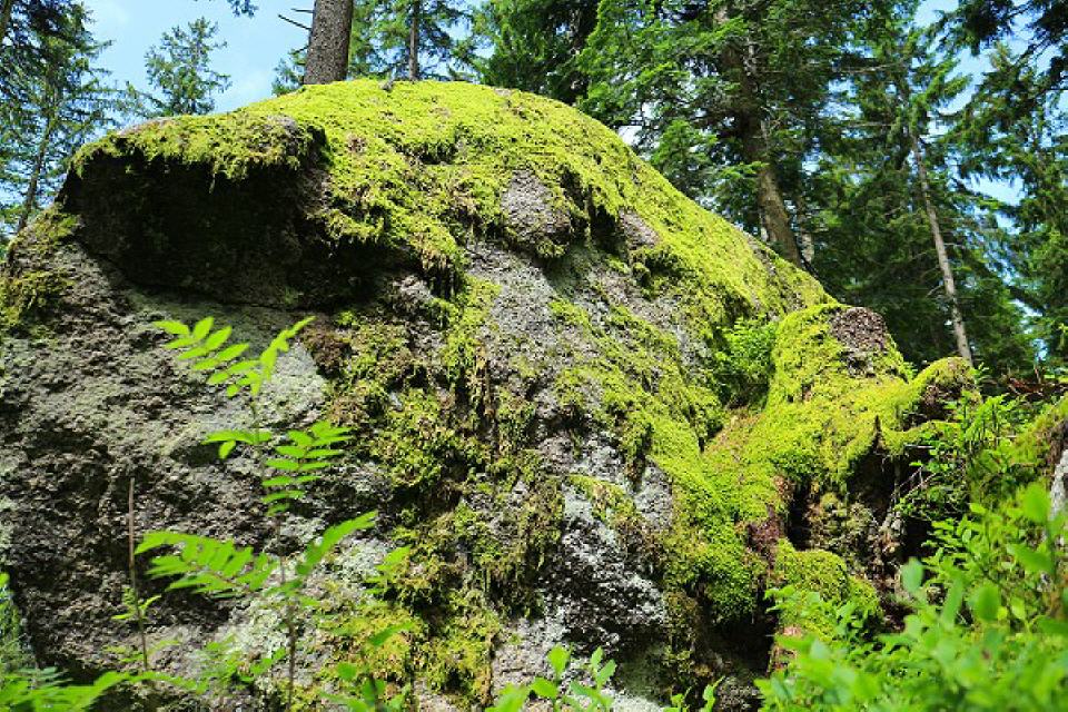3. Augenstein. In direkter Nachbarschaft versteckt sich zwischen einigen Jungtannen ein riesiger Felsblock. Auf seiner Oberseite entdecken wir zwei fast auf einer Höhe nebeneinander liegende kreisrunde Schalen. Als hätte der Felsen seinen Blick gegen den Himmel gerichtet.