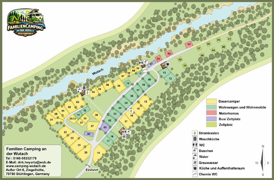 Der Campingplatz an der Wutach in Stühlingen im Landkreis Waldshut liegt direkt an der Wutach. Machen Sie gerne Urlaub im Süden? Dann sind Sie auf unserem Campingplatz für Zelte, Caravans und Wohnmobile im südlichen Schwarzwald direkt an der Schweizer Grenze genau richtig! Wasseranschlüsse mit Entsorgungsplatten für Abwasser an jedem Platz.