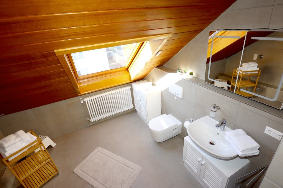 - Sanitär: großes Badezimmer, WC, Dusche, Waschbecken, Spiegel, Fön