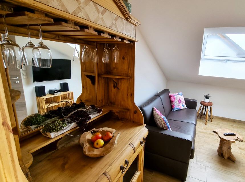 Ferienwohnung 1: geeignet für 2 Personen und 2 Kinder, 38 qm Wohnfläche, offener Wohn- / Koch- / Essbereich und Bad.