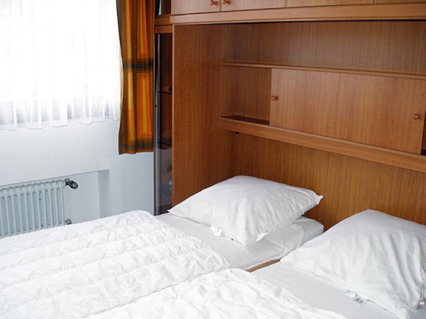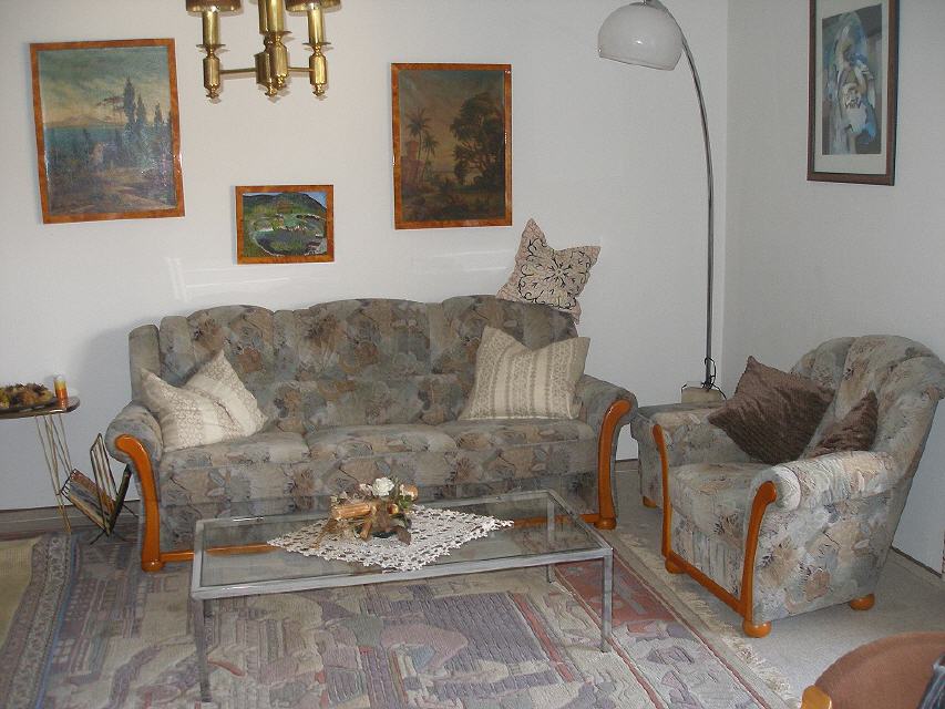 Für das gemütliche Gespräch oder den Genuss des Fernsehens steht eine Couch mit Sessel parat. Der Blick vom großen Tisch über die Dächer, verbunden mit der Ruhe, verführen zum Lesen und Relaxen. Bücher sind reichlich dafür vorhanden. Im großen, hellen Schlafzimmer kann man zwei oder nur ein Bett aus der großen Schrankwand klappen und liegt dort wie in den verborgen Betten des Wohnzimmers auf guten Matratzen bei Bedarf mit Überlänge. Die geräumige Schrankwand bietet viel Platz. Zudem stehen noch zwei kleine Sessel parat.