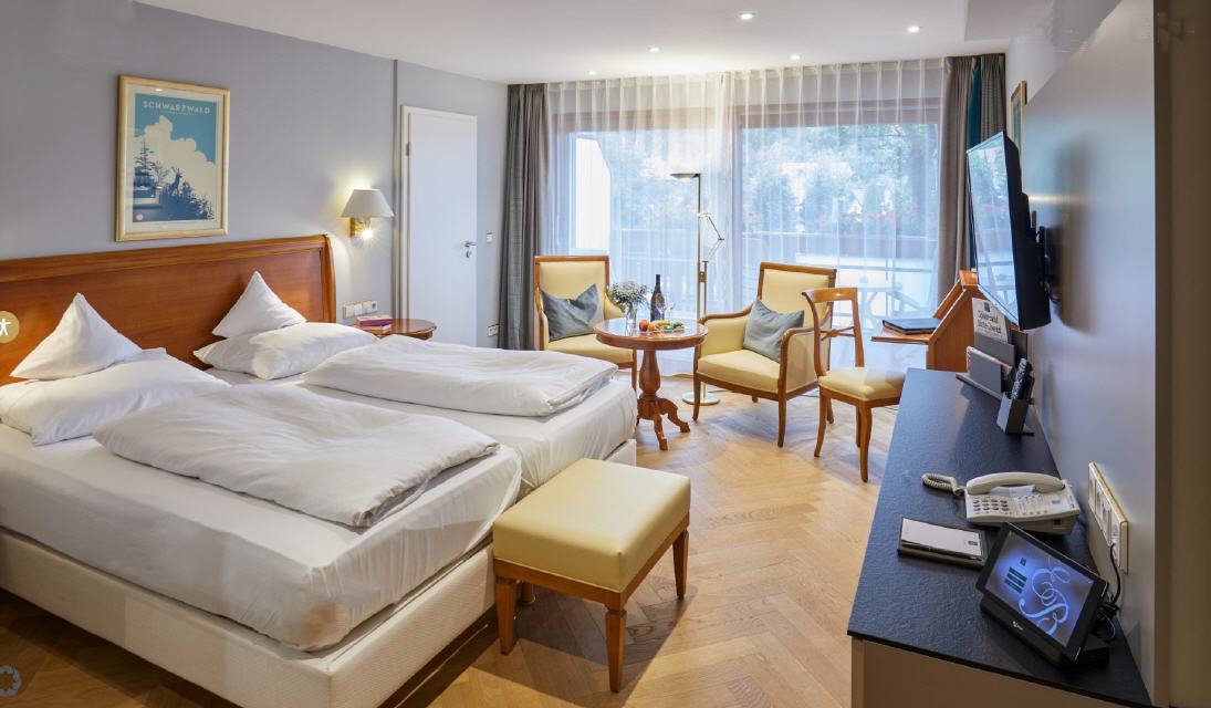 Doppelzimmer Münstertal. Doppelzimmer 42 qm, Balkon 8 qm, Waldseite mit Morgensonne. Der dezent-exquisite Einrichtungsstil gibt auch hier den Ton an: Harmonische Leichtigkeit in einer warmen Atmosphäre sorgt für Erholung ab dem ersten Augenblick. Der große Balkon lädt zum Frühstück in der Morgensonne ein und verspricht an heißen Sommertagen angenehme Kühle. Besondere Ausstattungsmerkmale: zum Teil überlange Betten (210 x 180 cm), separate Toilette und begehbare Ankleide.
