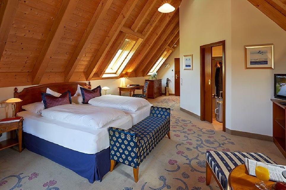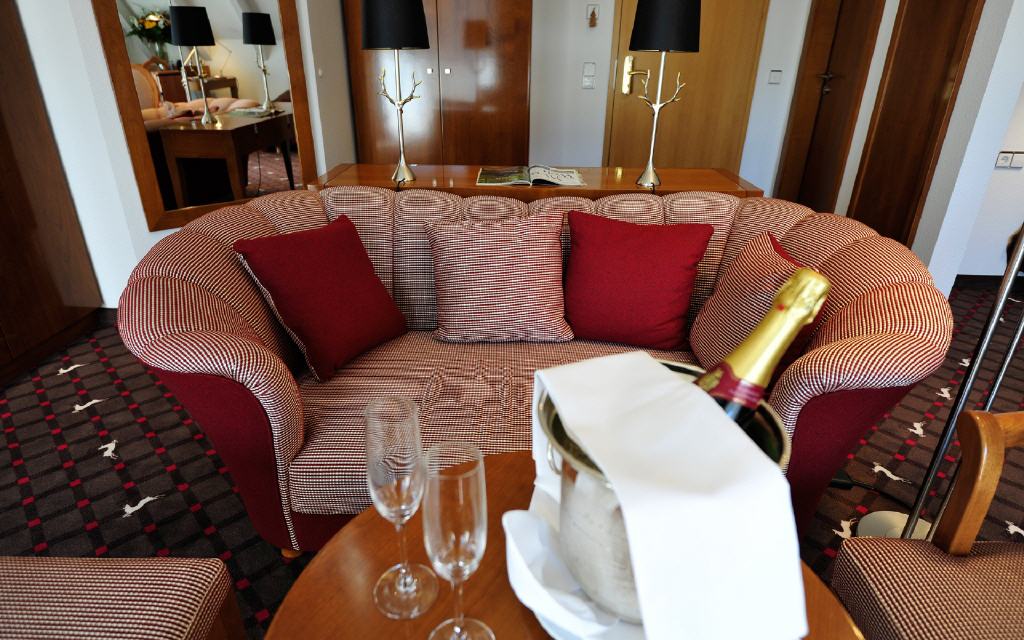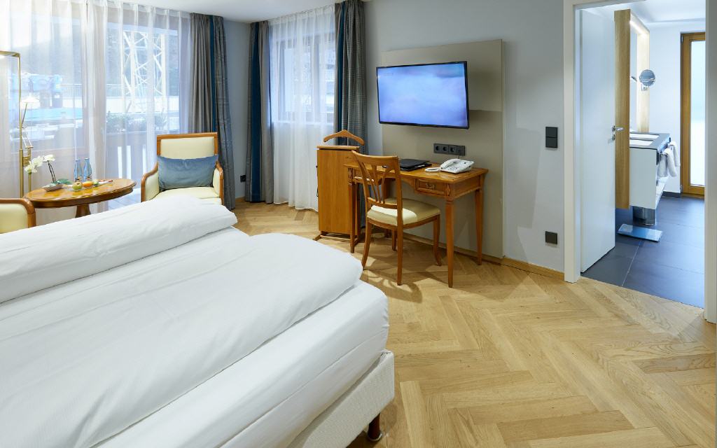 Jedes Zimmer und jede Suite ist mit Smart-TV, Mediathek, Radio, Tablet und WLAN ausgestattet. Design-Echtholzmöbel, Eiche-Echtholzparkett, exklusive Stoffe von JAB, hochwertige Box-Springbetten mit bandscheibengerechten Matratzen, Sitzecke, Minibar, Safe sowie ein elektrischer Hosenbügler sorgen in allen Zimmern für eine höchstkomfortable Erholung.
