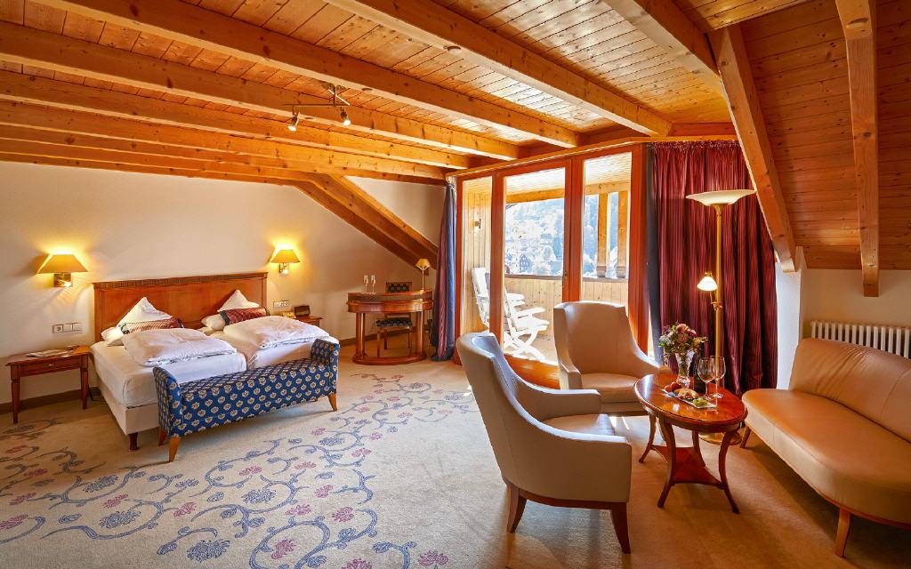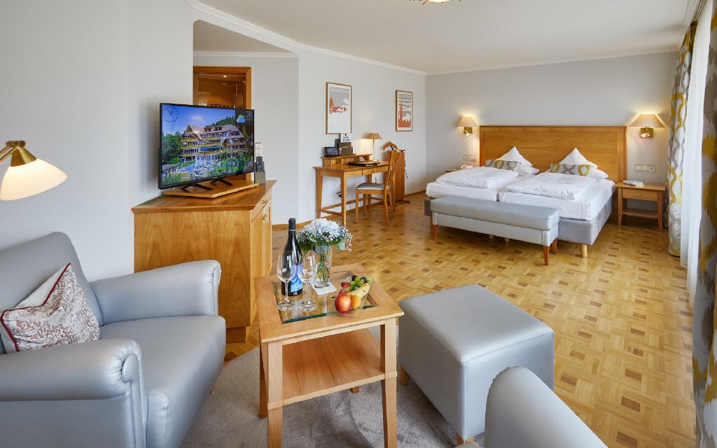 Junior-Suite Glottertal. Junior-Suite, 48 qm, möblierter Balkon 12 qm oder Loggia 6 qm, Südwestseite zum Garten, mit Nachmittags- und Abendsonne. Das Interieur dieser beiden Suiten verzaubert Sie mit geschmackvollem Landhausstil gepaart mit modernem Edel-Touch: Die Suiten Glottertal bestichen durch ihre unaufdringliche Behaglichkeit in einem perfekt abgestimmten Mix aus charmanten Stilelementen. Warme Hölzer und heitere Farben schaffen ein behagliches Wohn-Ambiente. Ein geräumiges und ruhiges Doppelzimmer mit Nachmittags- und Abendsonne, das Ihnen einen herrlichen Blick auf die gepflegten Gartenanlagen gewährt.
