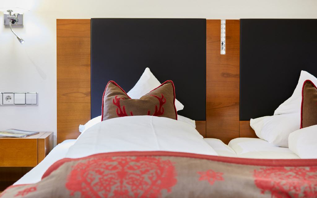 Doppelzimmer Gutachtal. Doppelzimmer 42 qm, möblierte Loggia/Balkon 4 bis 9 qm, Südwestseite mit Nachmittags- und Abendsonne. Hier wohnt die Lebensfreude: Das ruhige und lichtdurchflutete Doppelzimmer Gutachtal holt über die großen Glasfronten der Loggia oder Balkone die Nachmittags- und Abendsonne herein. Ausgesuchte Möbel und Accessoires setzen erfrischende Akzente zu den warmen Naturtönen. Das Special: Mit zum Teil überlangen Betten (210 x 180 cm) erfüllen wir die besonderen Anforderungen unserer großen Gäste.